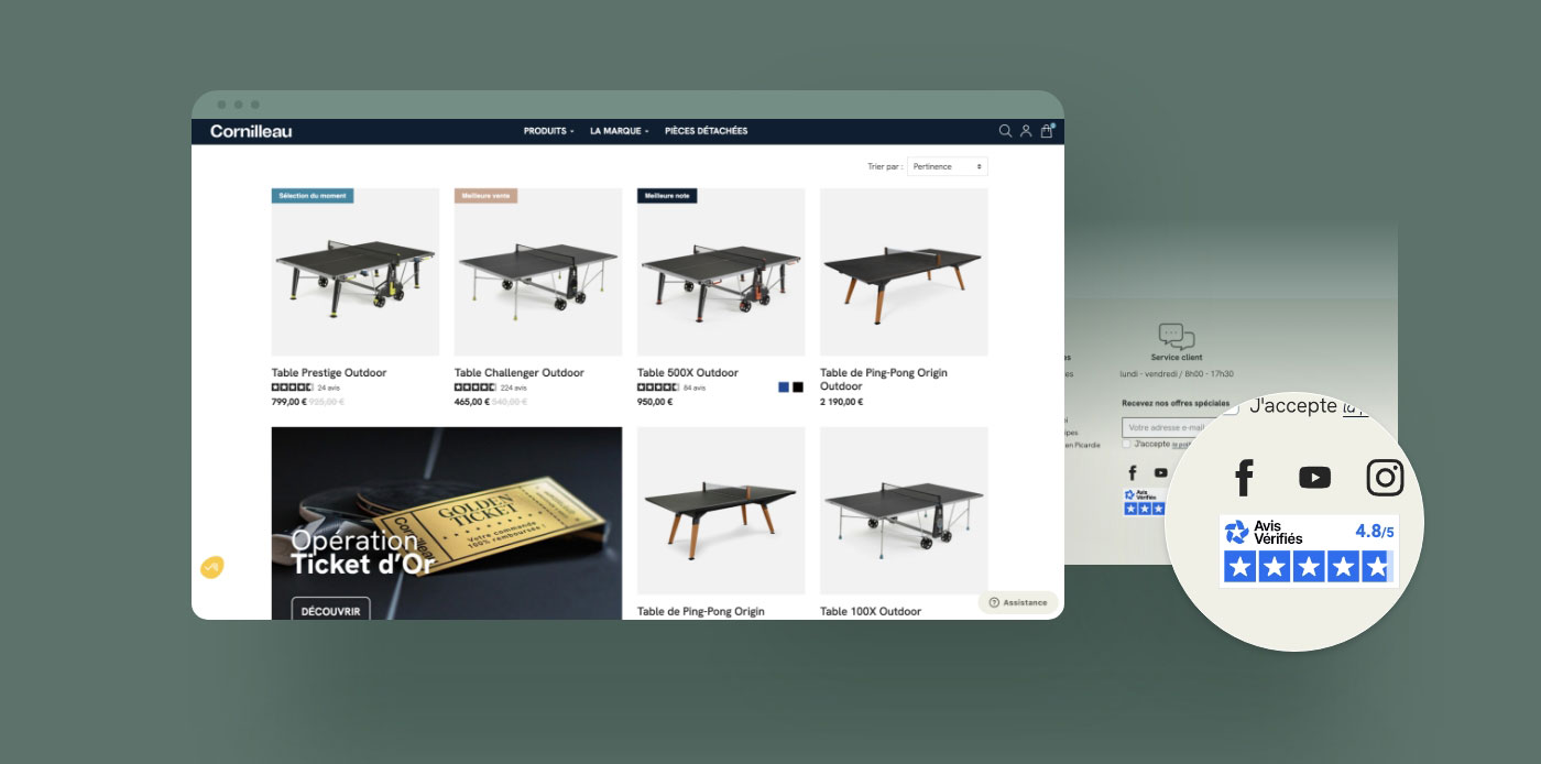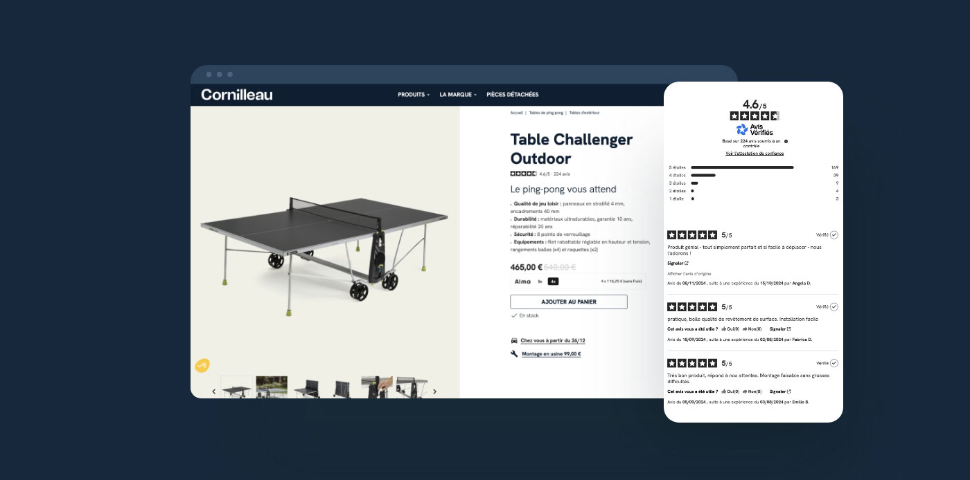 Sui siti e-commerce di Cornilleau, le recensioni dei clienti arricchiscono le schede prodotto e rappresentano una prova concreta della qualità dei prodotti. Questo aiuta i clienti a fare la loro scelta e aumenta la fiducia al momento dell’acquisto. Inoltre, questi contenuti generati dagli utenti hanno un effetto positivo anche sulla visibilità dei prodotti nei motori di ricerca.